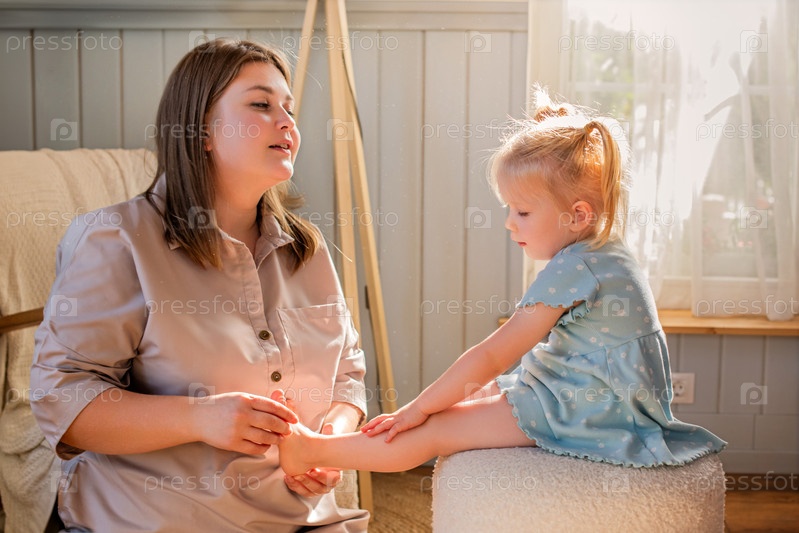 Мать играет с маленькой дочкой и щекочет ее босые ноги. Солнечный яркий снимок