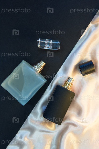 Два флакона духов на бумажном и текстильном фоне