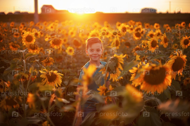 Портрет красивого светловолосого мальчика на летнем поле подсолнечников на открытом воздухе. Милый школьник веселится теплым летним вечером на закате
