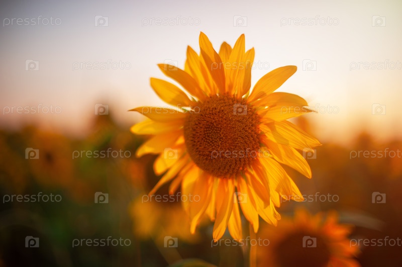 Подсолнух крупным планом на фермерском поле на закате летом