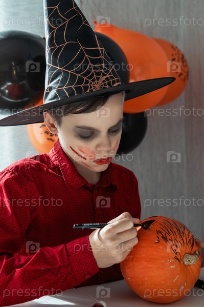 Концепция карнавала или маскарада на Хэллоуин. Счастливый подросток в костюме рисует тыкву для празднования Хэллоуина
