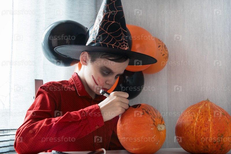 Концепция карнавала или маскарада на Хэллоуин. Счастливый подросток в костюме рисует тыкву для празднования Хэллоуина