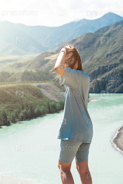 Внутренний туризм, путешествия, отдых и концепция свободы: женщина на слиянии двух рек Катуни и Чуи в горах Алтая, красота летнего дня