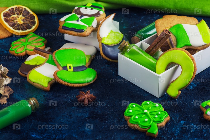 Имбирное печенье ко дню святого Патрика на темном каменном фоне