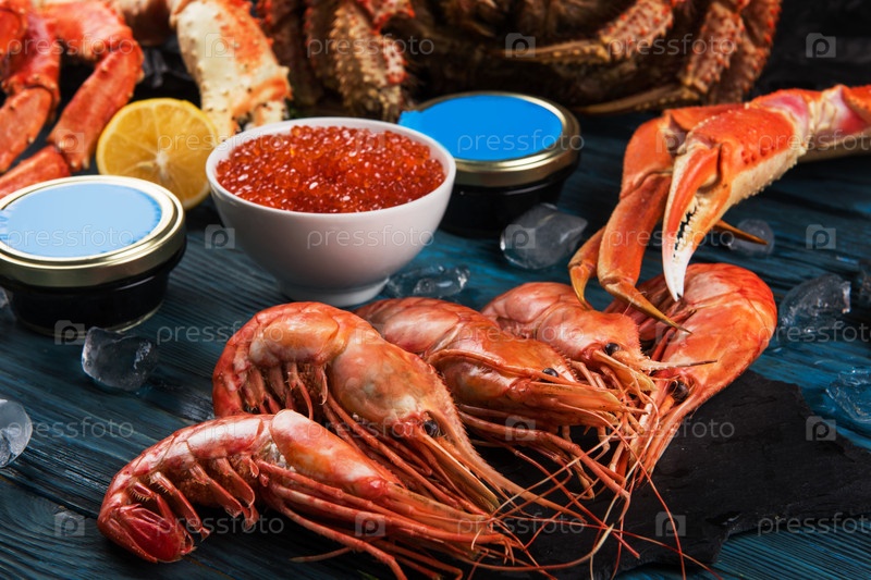 Набор морепродуктов: красная и черная икра, конечность волосатого краба, конечность краба-стригуна, дальневосточный камчатский краб