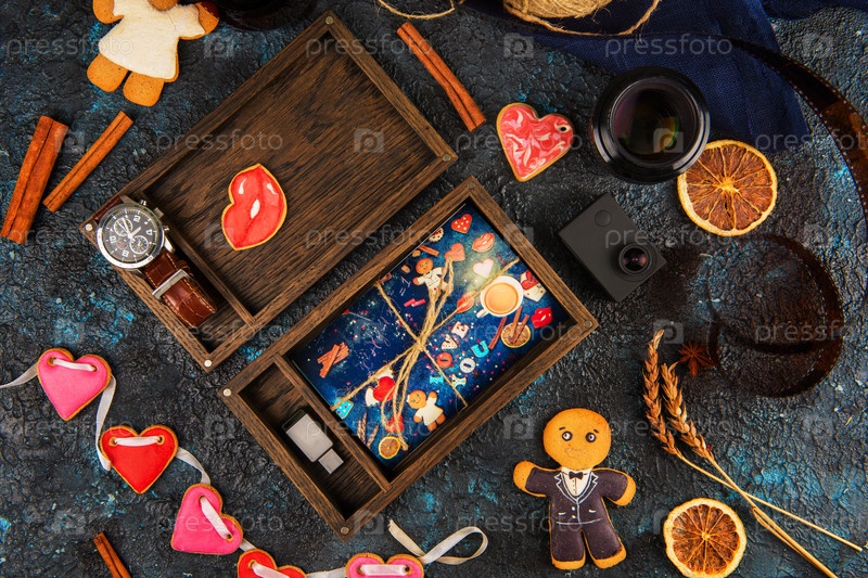 Деревянная фотокоробка с фотографией на День святого Валентина или День свадьбы. Украшена пряниками. Романтическая или любовная концепция. Пряники на День святого Валентина на темном бетонном фоне
