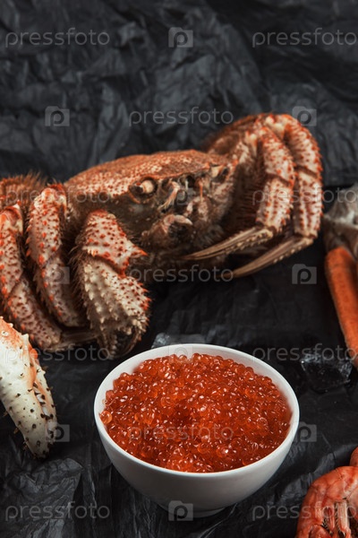 Крупный план волосатого краба с тарелкой красной икры