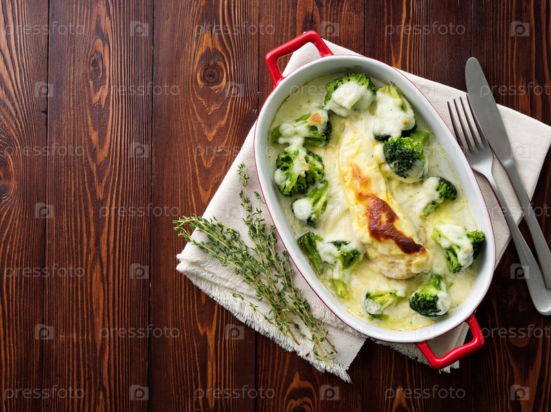 Куриное филе, запеченное с брокколи в соусе бешамель на темном деревянном столе. Здоровая пища, чистое питание, вид сверху, копировальное пространство