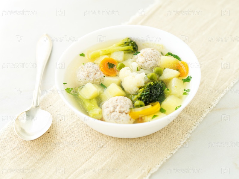 Тарелка супа, чашка бульона с овощами, фрикадельки из индейки и курицы, вид сбоку