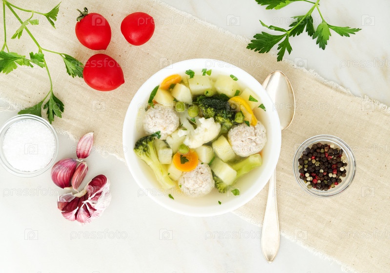 Тарелка супа, чашка бульона и овощей, фрикадельки из индейки и курицы, вид сверху