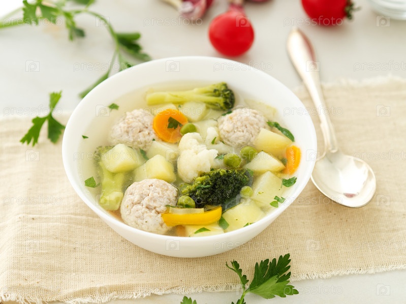 Тарелка супа, чашка бульона с овощами, фрикадельки из индейки и курицы, вид сбоку