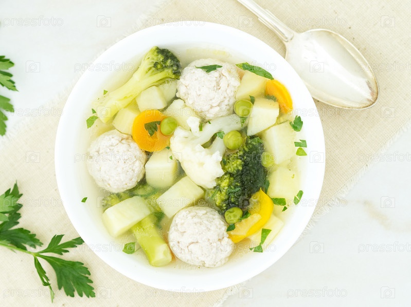 Тарелка супа, чашка бульона и овощей, фрикадельки из индейки и курицы, вид сверху