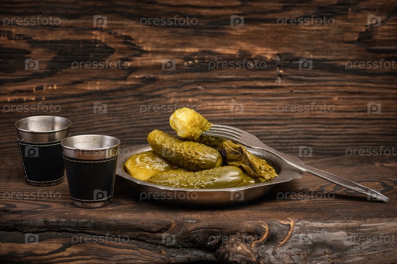 Вкусные маринованные огурцы в металлической миске с вилкой на деревянном столе