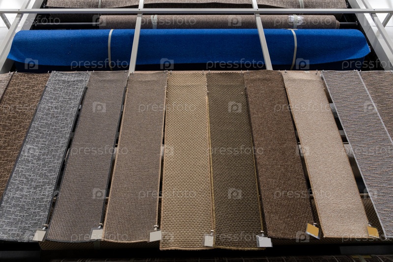 Большой ассортимент ковров в магазине. Магазин ковров. Витрина со скрученными коврами