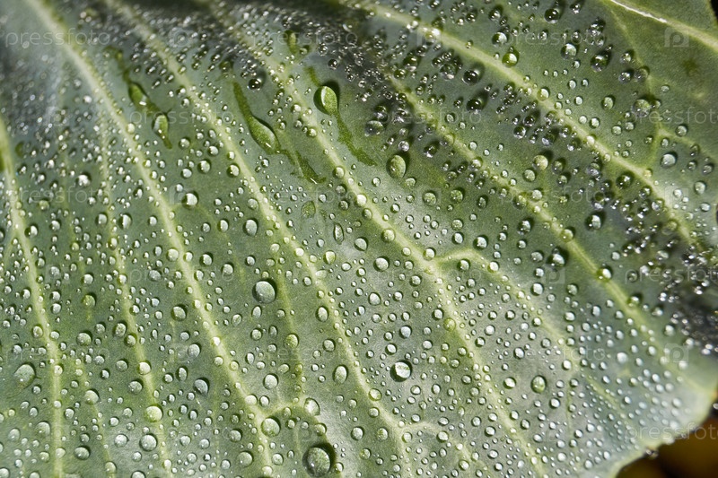 Утренняя роса на листьях капусты после ночного замораживания. Капли росы похожи на очень сильные линзы