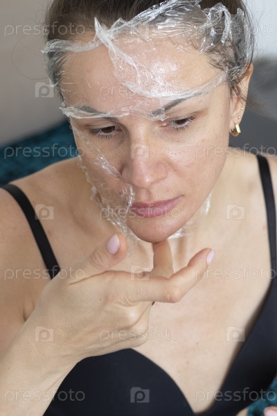 Женщина обматывает лицо и шею пищевой пленкой в качестве процедуры по уходу за кожей. Косметика