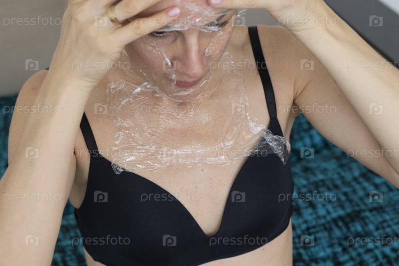 Женщина обматывает лицо и шею пищевой пленкой в качестве процедуры по уходу за кожей. Косметика