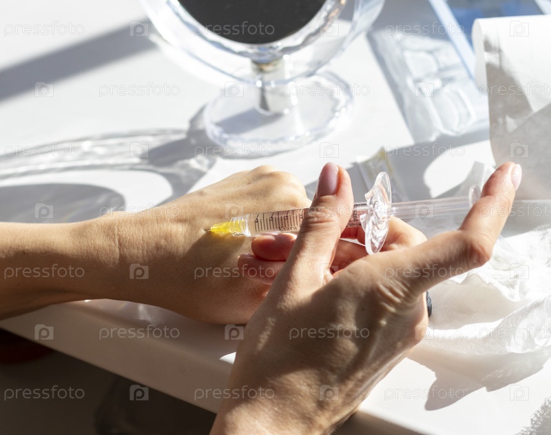 Женщина проводит мезотерапию, процедуру биоревитализации, вводит лекарство в руку. Косметика