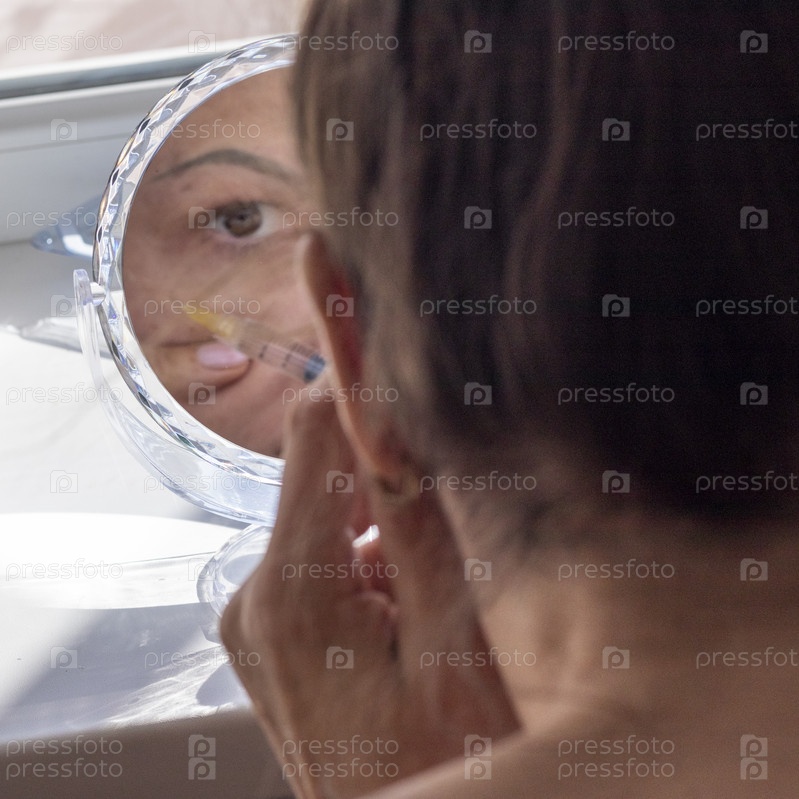 Женщина проводит мезотерапию, процедуру биоревитализации, инъекции лекарств в шею и лицо. Косметика
