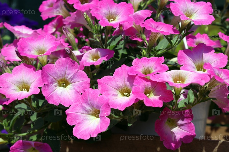Ярко-розовые петунии с приятным ароматом цветут в пластиковом горшке