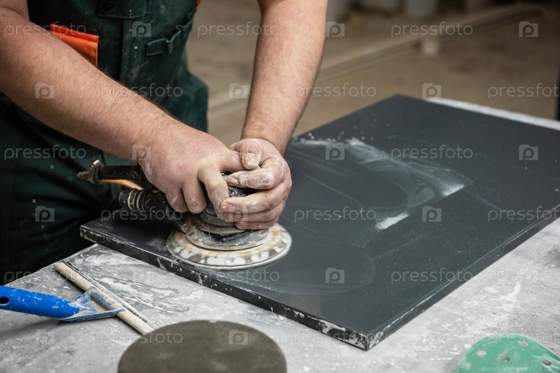 Производство каменной мебели. Работник шлифует поверхность фасада шлифовальной машиной