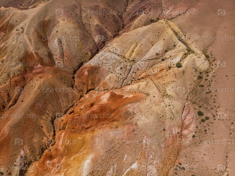 Аэрофотоснимок текстурированных желто-красных гор, напоминающих поверхность Марса