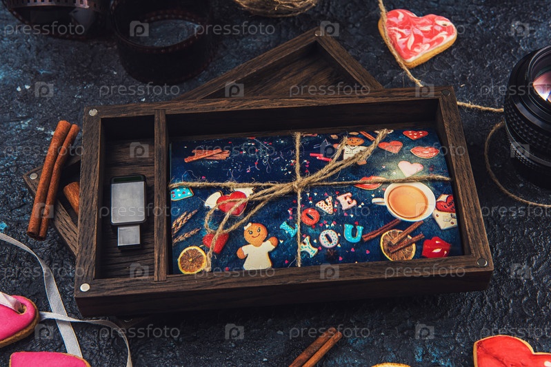 Деревянная фотокоробка с фотографией на День святого Валентина или День свадьбы. Украшена пряниками. Романтическая или любовная концепция. Пряники на День святого Валентина на темном бетонном фоне