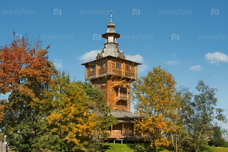 Московская область. Россия. 27 сентября 2023 года. Уникальная архитектура православного деревянного комплекса у святого источника Гремячий Ключ