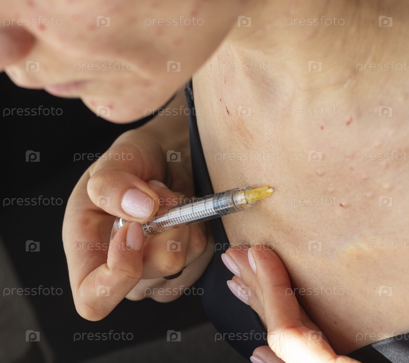 Женщина проводит мезотерапию, процедуру биоревитализации, инъекции лекарств в шею и лицо. Косметика