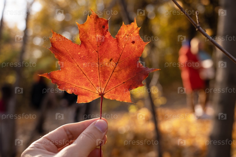 Кленовый лист в руке на ярко-желтом и оранжевом фоне осени