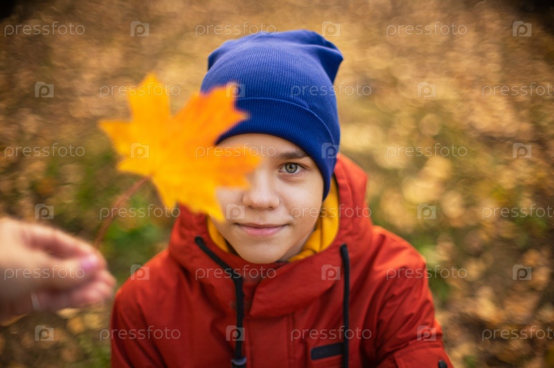 Осенний портрет подростка с кленовыми листьями на фоне осенней природы. Малая глубина резкости