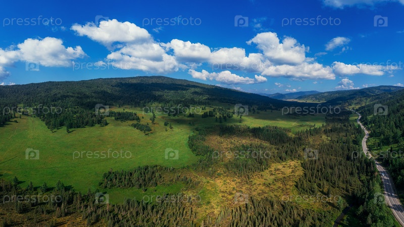 Чуйский тракт в горах Алтая. Одна из самых красивых дорог в мире. Снимок с воздуха с дрона