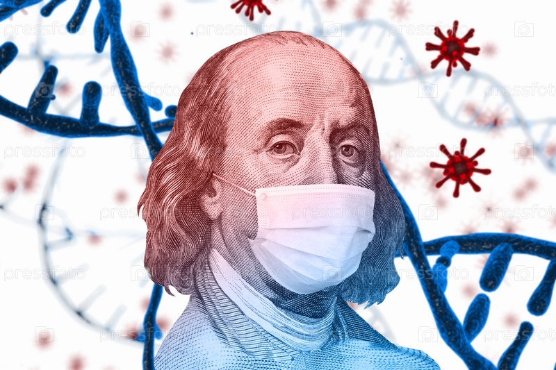 Бенджамин Бен Франклин изолировал лицо от 100-долларовой банкноты с маской на фоне ковида. Концепция мирового финансового кризиса и пандемии