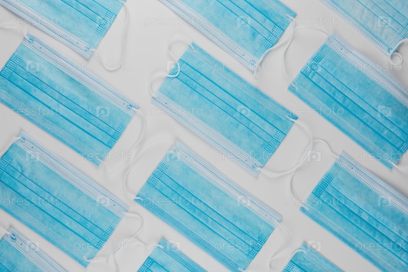 Медицинские маски на белом фоне для защиты от коронавируса. Концепция эпидемии и здравоохранения, узор, плоская планировка