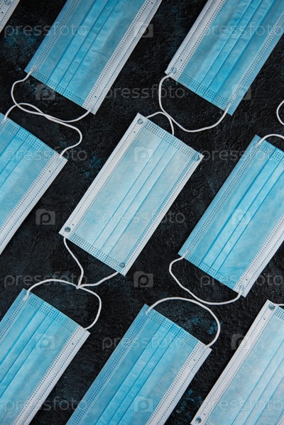 Медицинские маски на темном фоне для защиты от коронавируса. Концепция эпидемии и здравоохранения, узор, плоская планировка