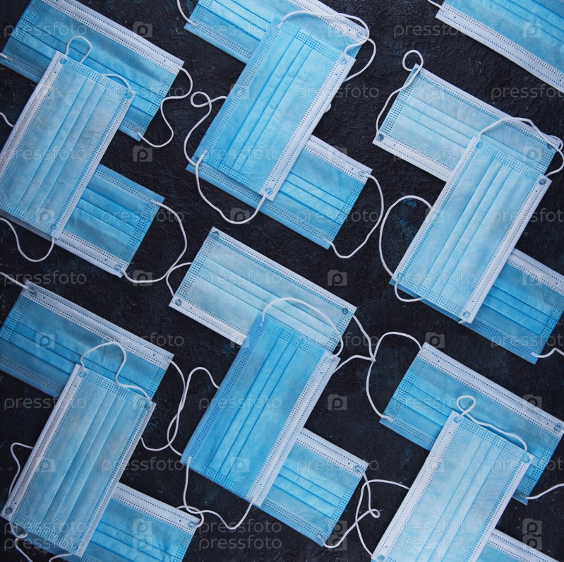 Медицинские маски на темном фоне для защиты от коронавируса. Концепция эпидемии и здравоохранения, узор, плоская планировка