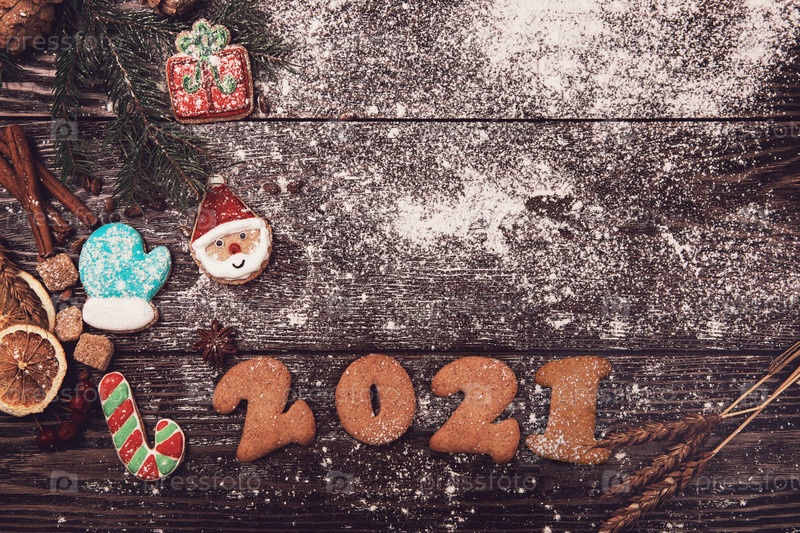 Новый год 2021, рождество и рождественская тема: праздничные пряники на деревянном фоне