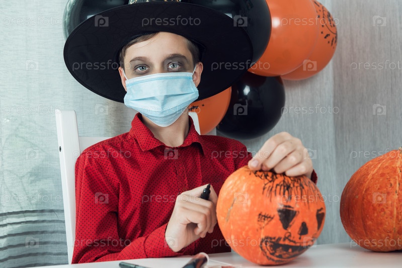 Мальчик-подросток в костюме и защитной маске для защиты от COVID-19 рисует тыкву, чтобы праздновать Хэллоуин