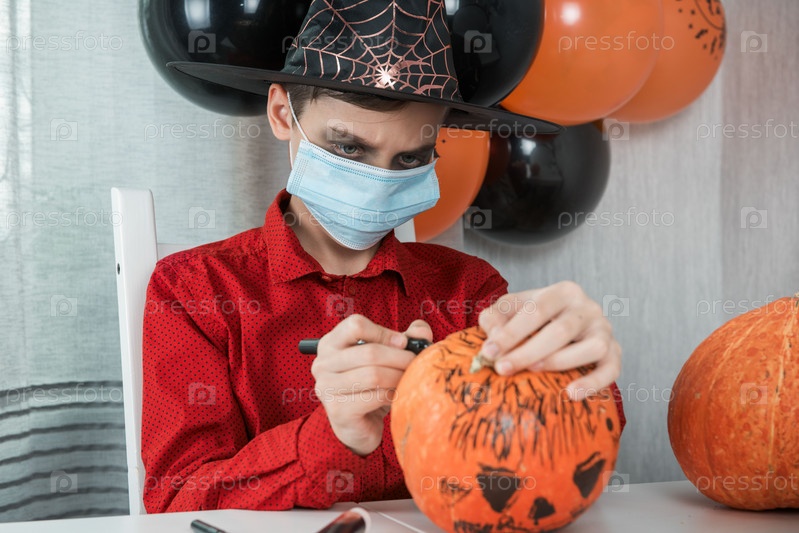 Мальчик-подросток в костюме и защитной маске для защиты от COVID-19 рисует тыкву, чтобы праздновать Хэллоуин