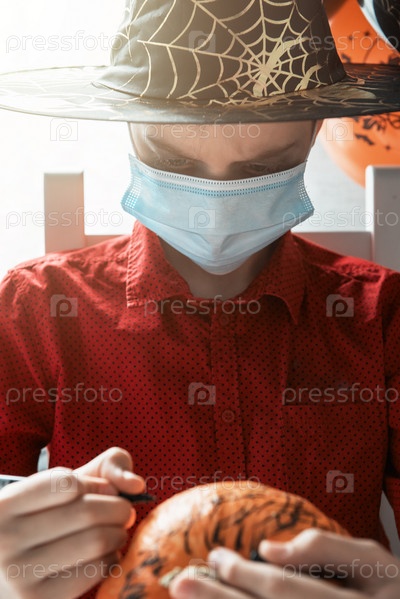 Мальчик-подросток в костюме и защитной маске для защиты от COVID-19 рисует тыкву, чтобы праздновать Хэллоуин