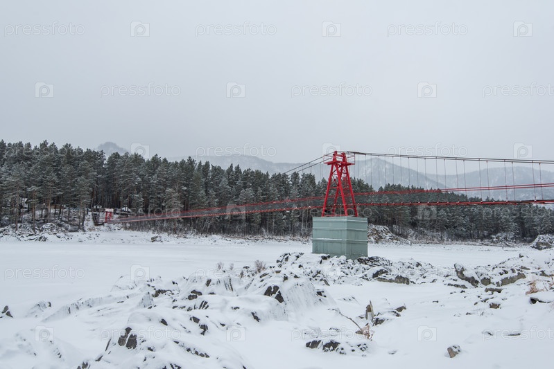 Подвесной мост над замерзшей горной рекой Катунь, Алтайские горы, Сибирь, Россия