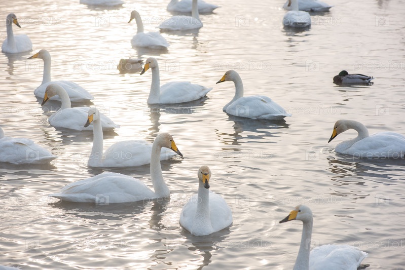 Красивые белые лебеди-кликуны плавают в незамерзающем зимнем озере. Место зимовки лебедей, Алтай, Сибирь, Россия