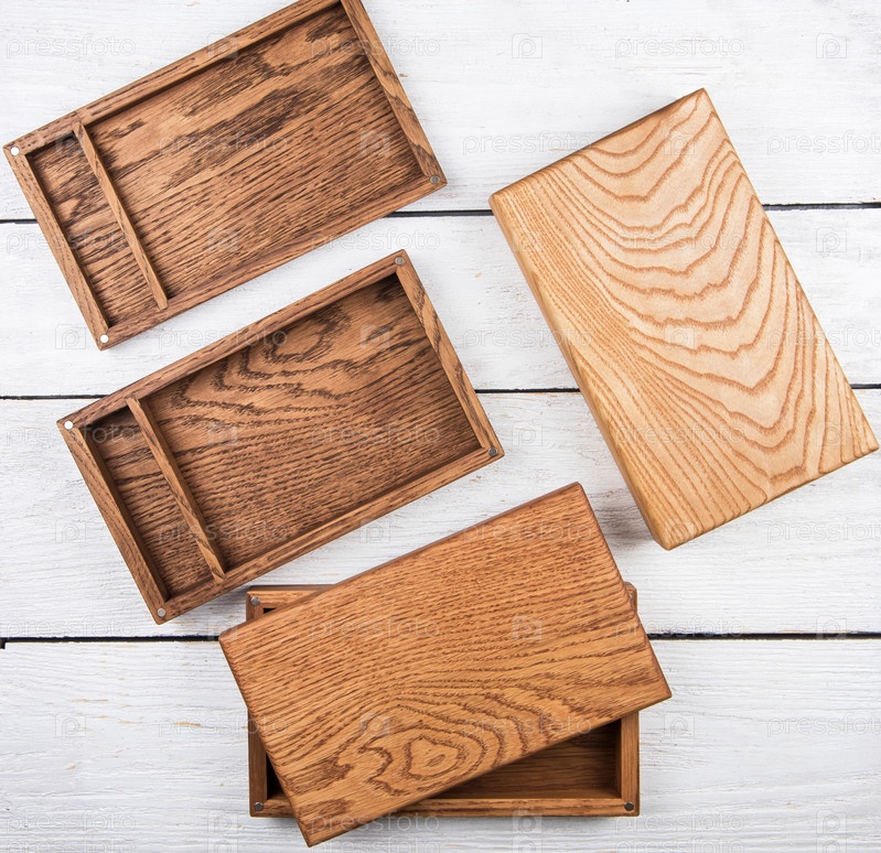 Деревянная фотокоробка для хранения фотографий на деревянном белом фоне