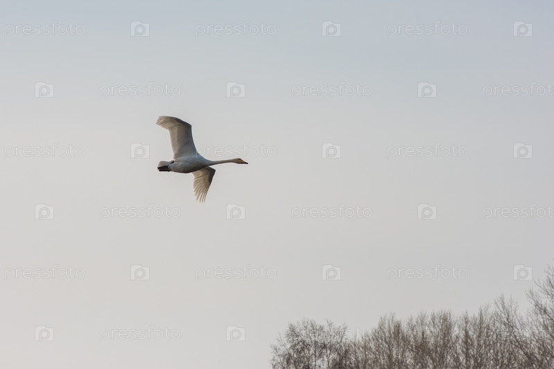 Летящие белые лебеди-кликуны, Алтай, Сибирь, Россия