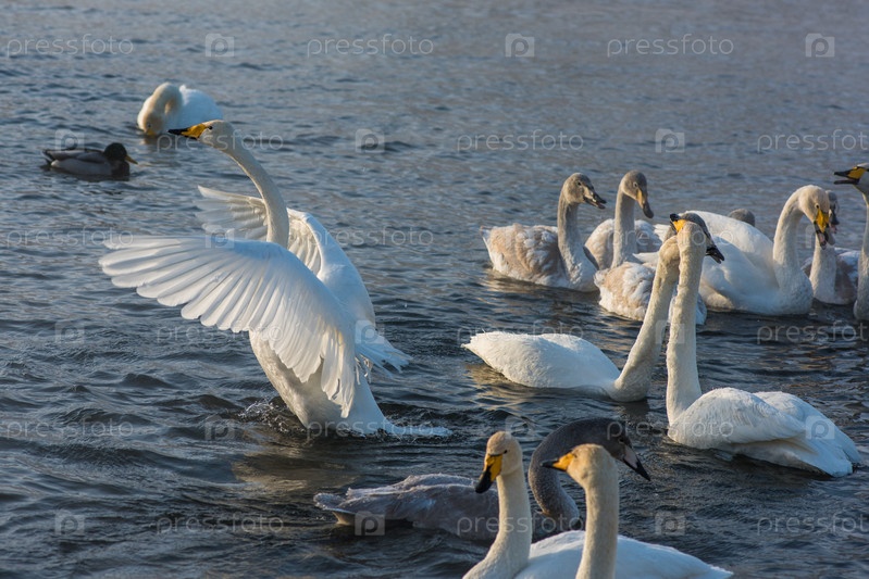 Борьба белых лебедей-кликунов в незамерзающем зимнем озере. Место зимовки лебедей, Алтай, Сибирь, Россия
