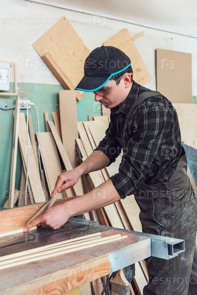 Плотник режет деревянную доску циркулярной пилой. Профессия, плотницкое дело и столярная концепция