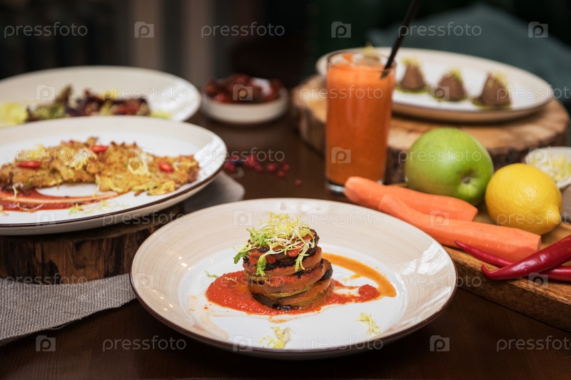 Здоровая вегетарианская еда на коричневой деревянной доске. Весенняя витаминная диетическая еда. Запеченные овощи слоями, фрукты и морковный сок