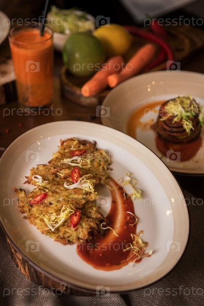 Здоровая вегетарианская еда на коричневой деревянной доске. Весенняя витаминная диетическая еда. Картофельные веганские блины с соком фруктов и овощей