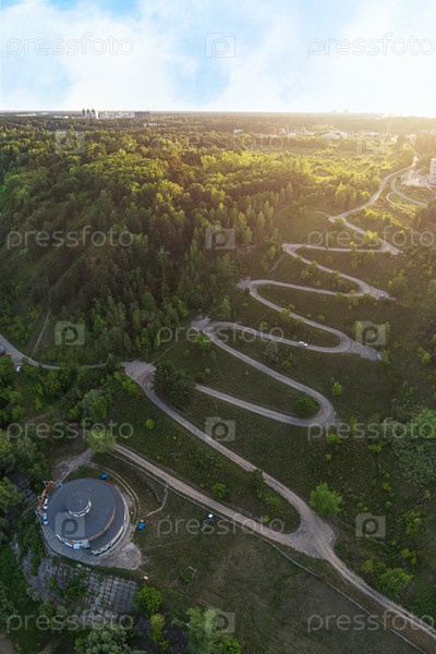 Вид сверху на извилистую дорогу в городе, вертикальная съемка с дрона