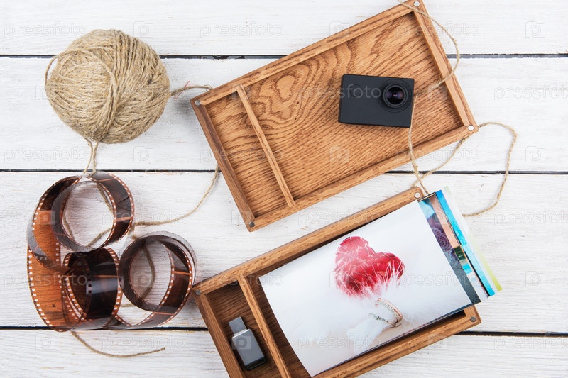 Деревянная фотокоробка с фотографией на День свадьбы. Романтическая любовь и концепция дня свадьбы